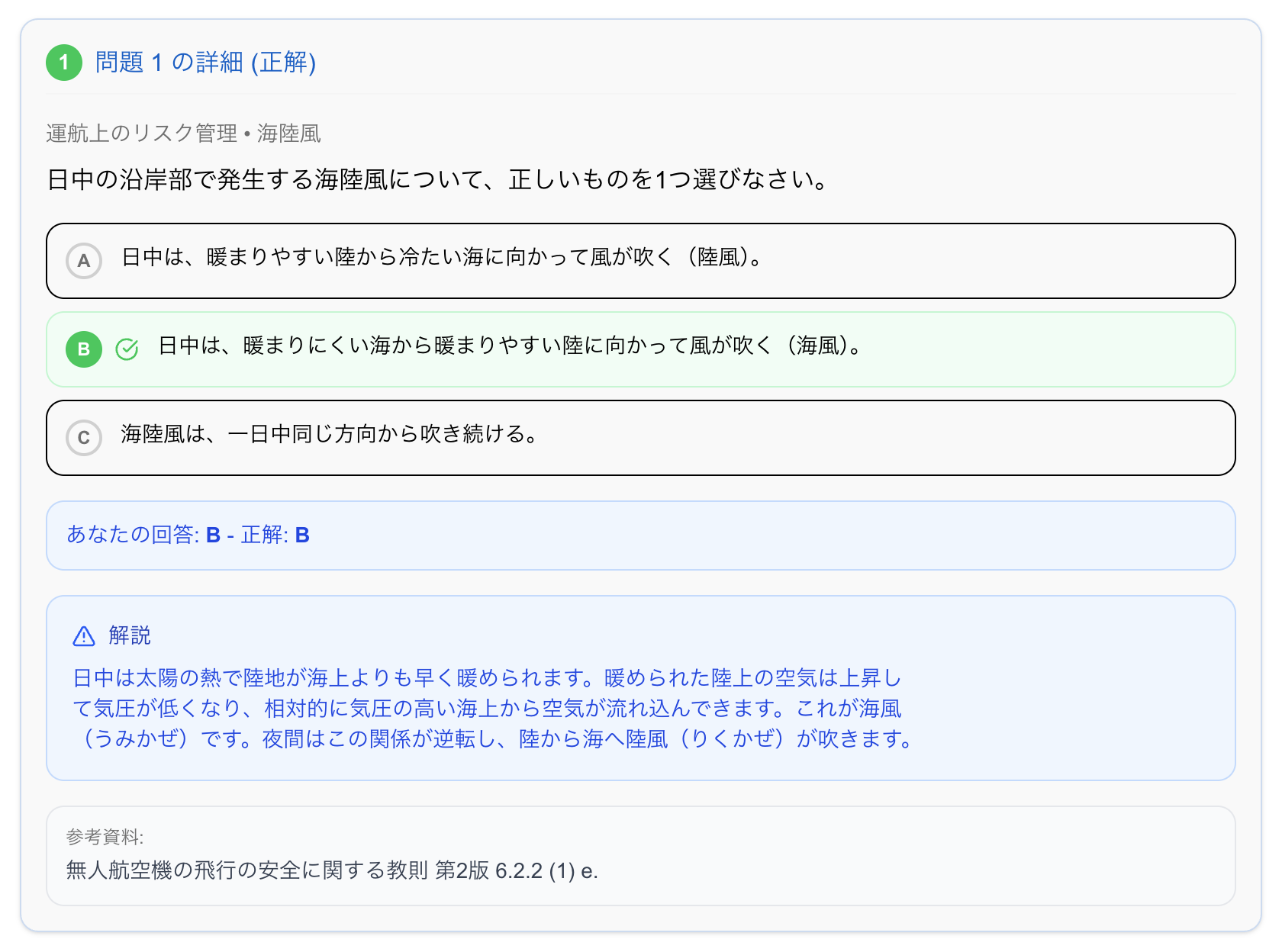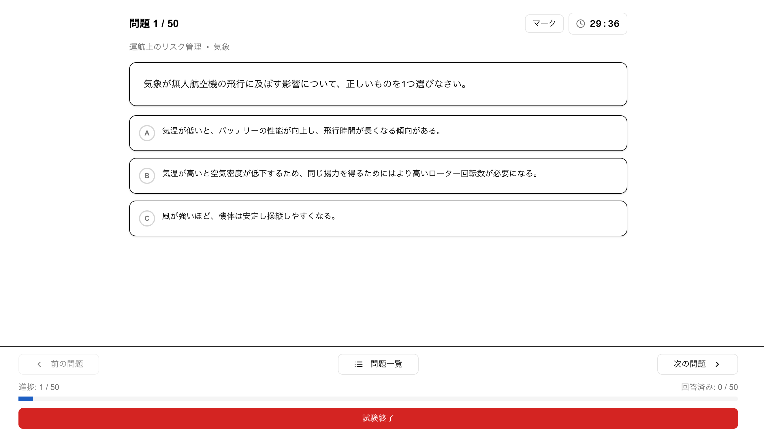 本サービスでは、無人航空機操縦士の筆記試験に対応した模擬試験を提供しています。