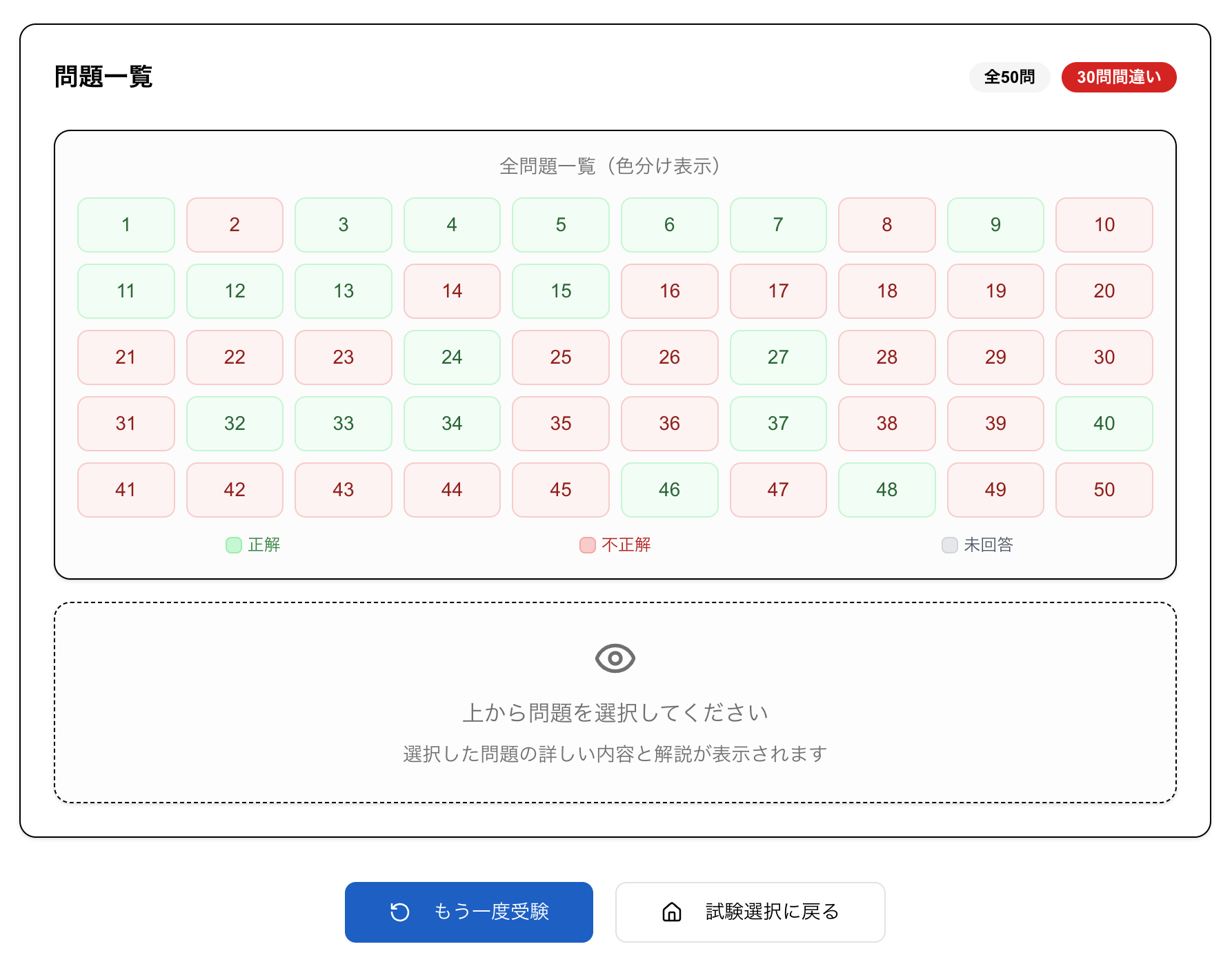 画面下部では全問題が色分けで一覧表示されます。問題番号をクリックすると、詳細な解説ページに移動できます。