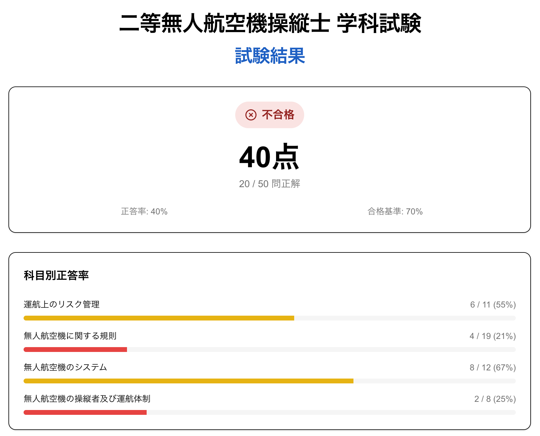 | 二等無人航空機操縦士 | 50問 | 30分 | 三肢択一式 | 1. 無人航空機に関する規則 2. 無人航空機のシステム 3. 無人航空機の操縦者及び運航体制 4. 運航上のリスク管理 |